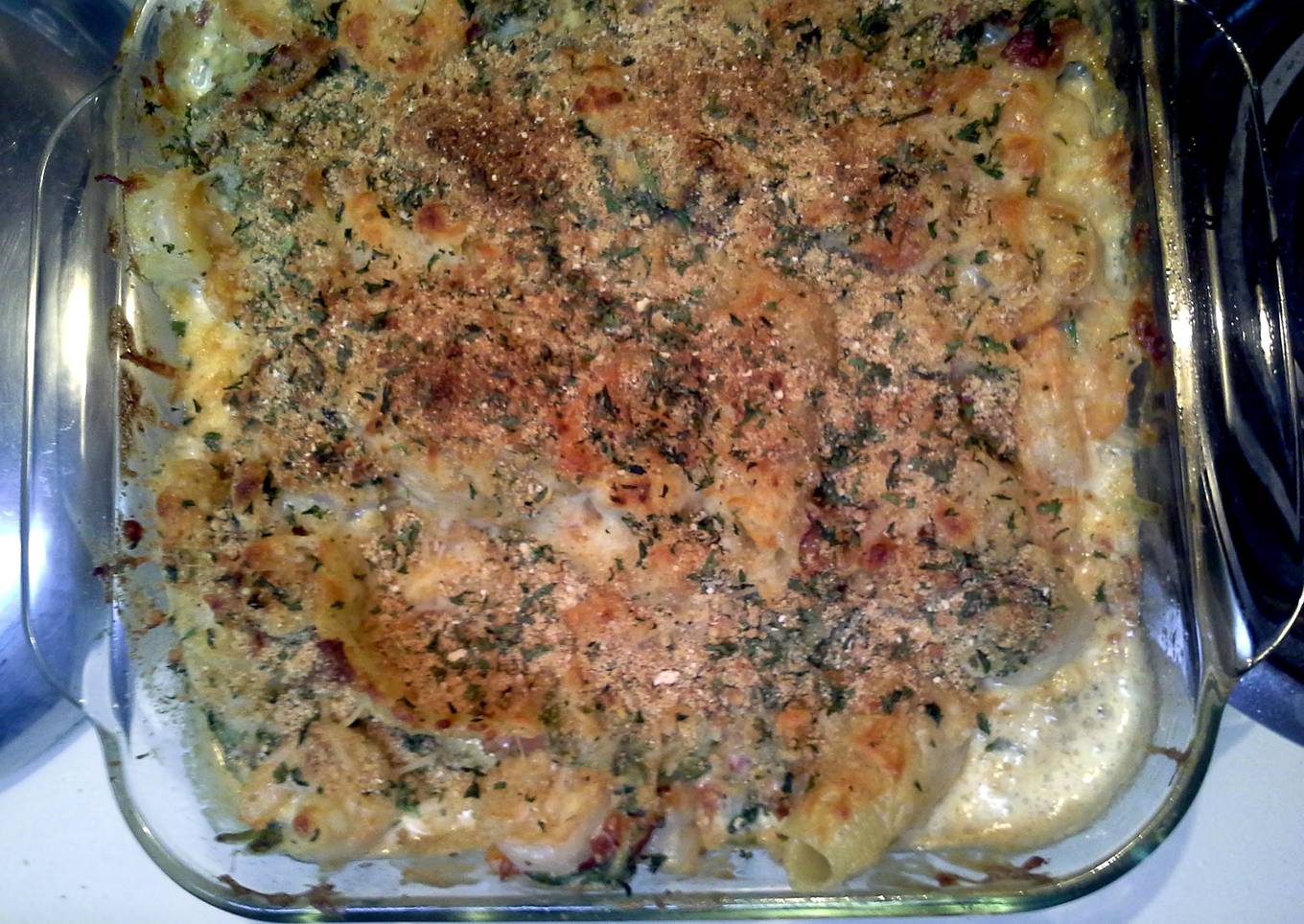 - Turn oven on to broil. Place pasta in a greased 2 quart baking dish (I use glass) add shrimp and spinach mixture and fold in to pasta. Top with a sprinkle of italian blend cheese, and 1/2 cup bread crumbs. Broil for 5-10 minutes until brown and bubbly.