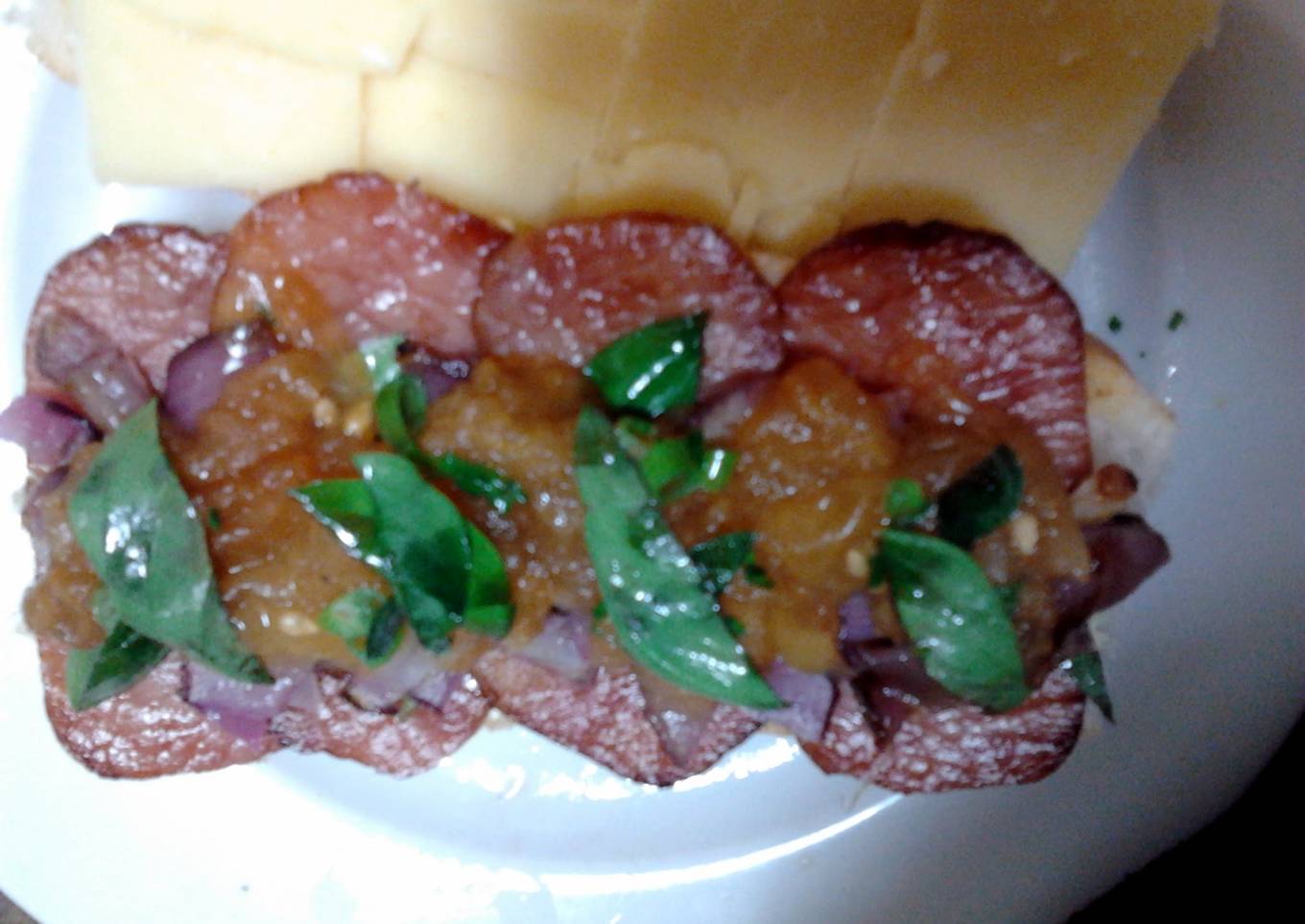 - place 4 pieces of your cooked bacon even onto each of the bottom of the butter rolls and then add some of if cooked onions ontop of the bacon followed by half the cooked tomatoes mixed with the basil ontop , close the roll top . serve hot and enjoy . :-) .