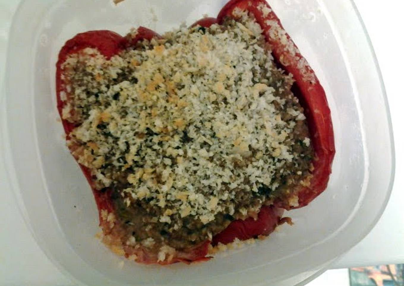 - Arrange stuffed peppers on glass baking dish and top with bread crumbs. Season with salt and black pepper to taste.
