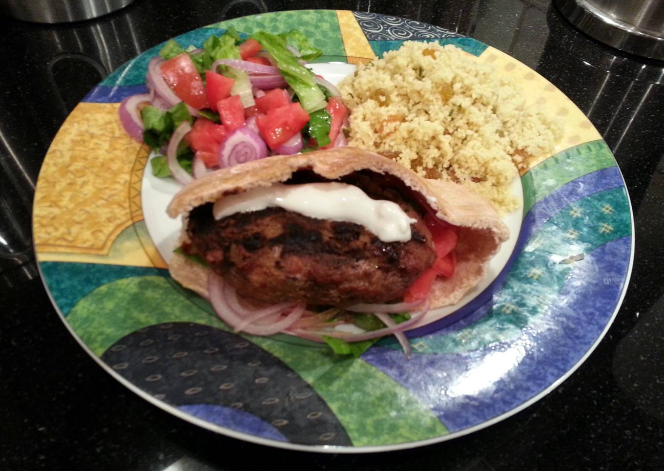 Adana Kabob is a ground lamb kabob mixed with spices and served in a sandwich or as a plate...topped with a yogurt lemon garlic sauce & I served couscous with toasted pine nuts & golden raisins as a side dish.....came out perfect & delicious!!!