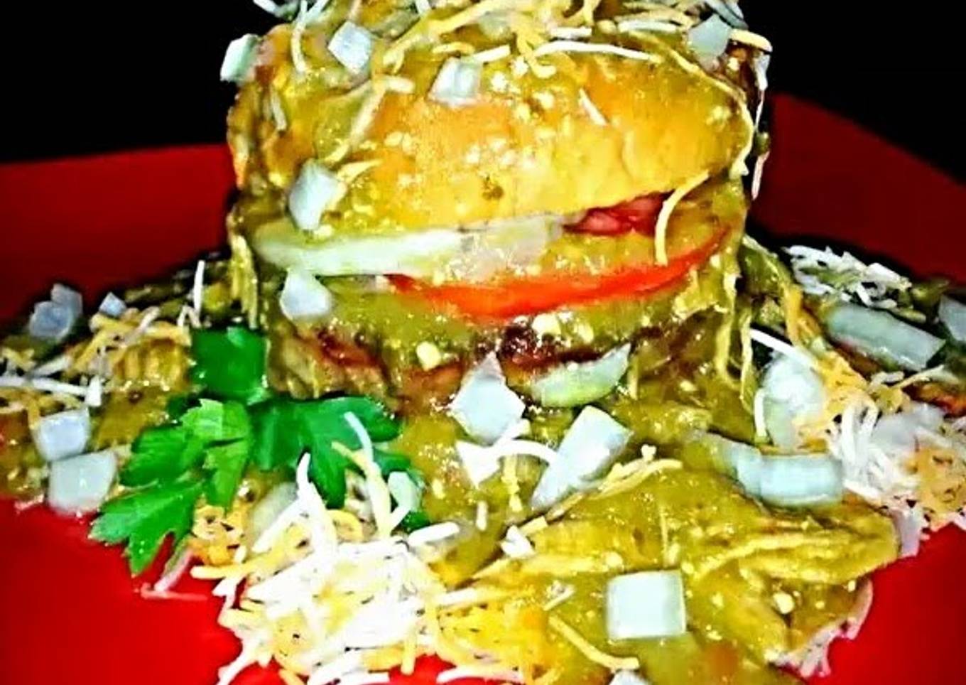 - Pour your simmering Chile Verde Sauce over your assembled burgers. Garnish liberally with chilled diced onions, fresh Cilantro and shreadded cheese.
