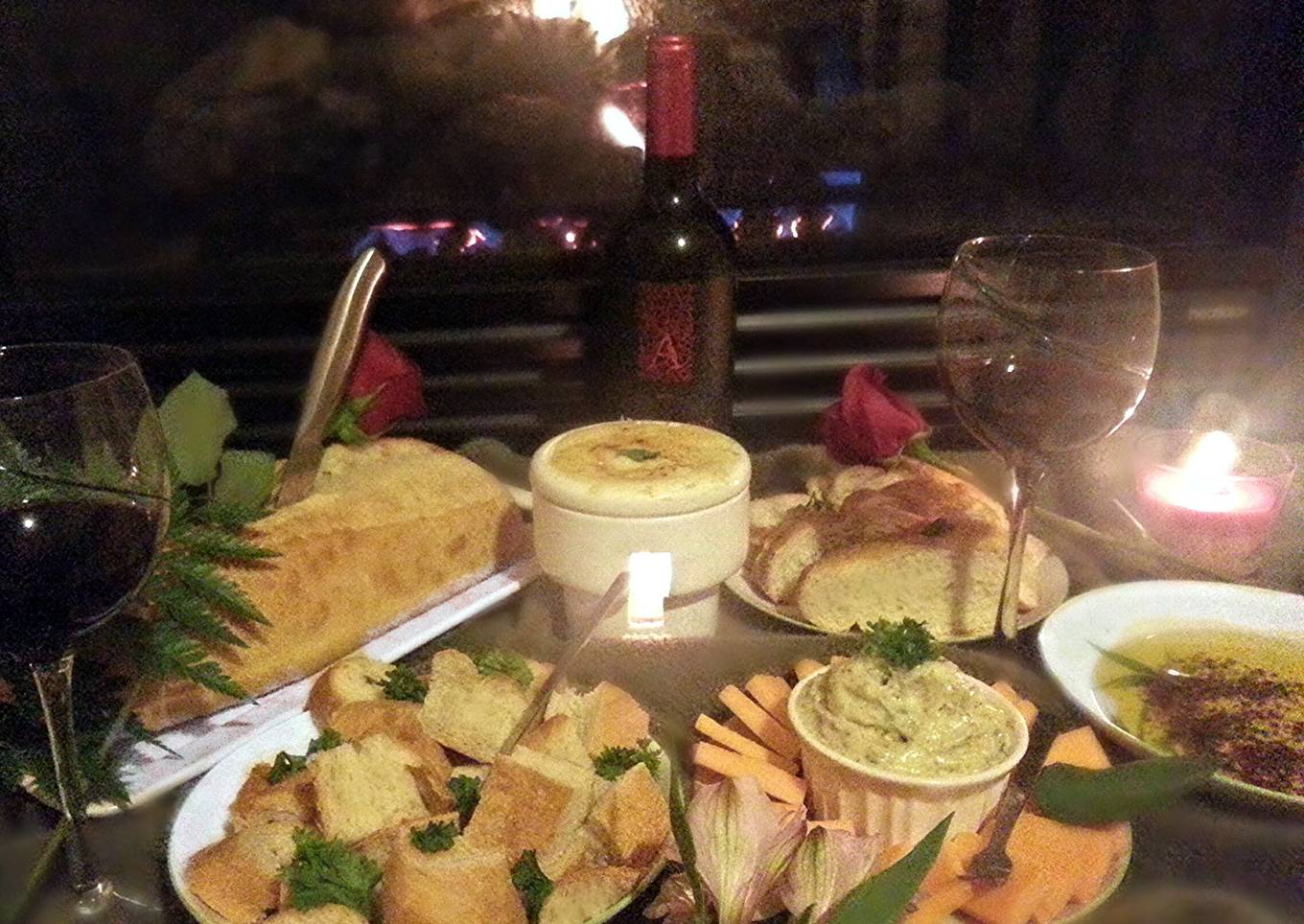 Forget what your mother told you about eating in bed and imagine this. A roaring fireplace, fresh breads dipped in warm garlic infused olive oil, fondue, chilled extra sharp cheeses, garlic butter, honey butter, several bottles of Cabernet Sauvignon and feeding your special someone - all while lying in bed!